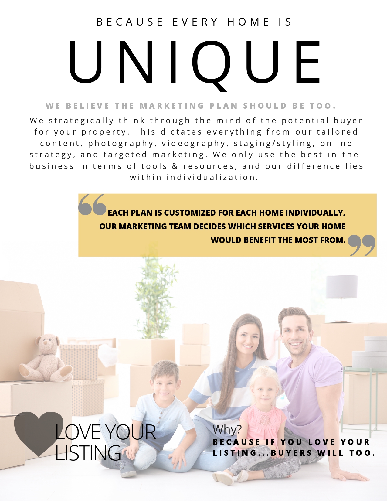 During all phases of a listing from the initial paperwork and promotion through the very last details of the closing, we personally attend to all of the details. As a result, the large majority of our transactions come through referrals and repeat business. Check out our proven Marketing Plan below: